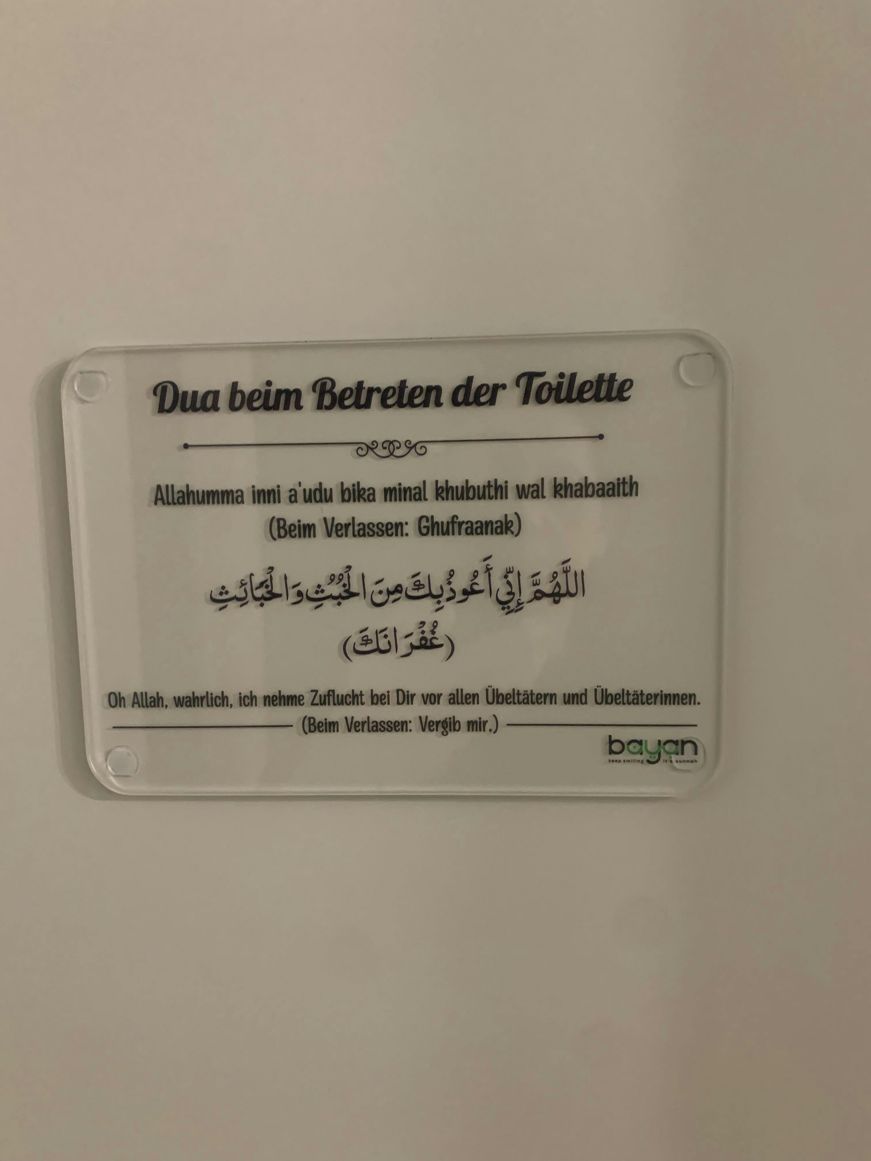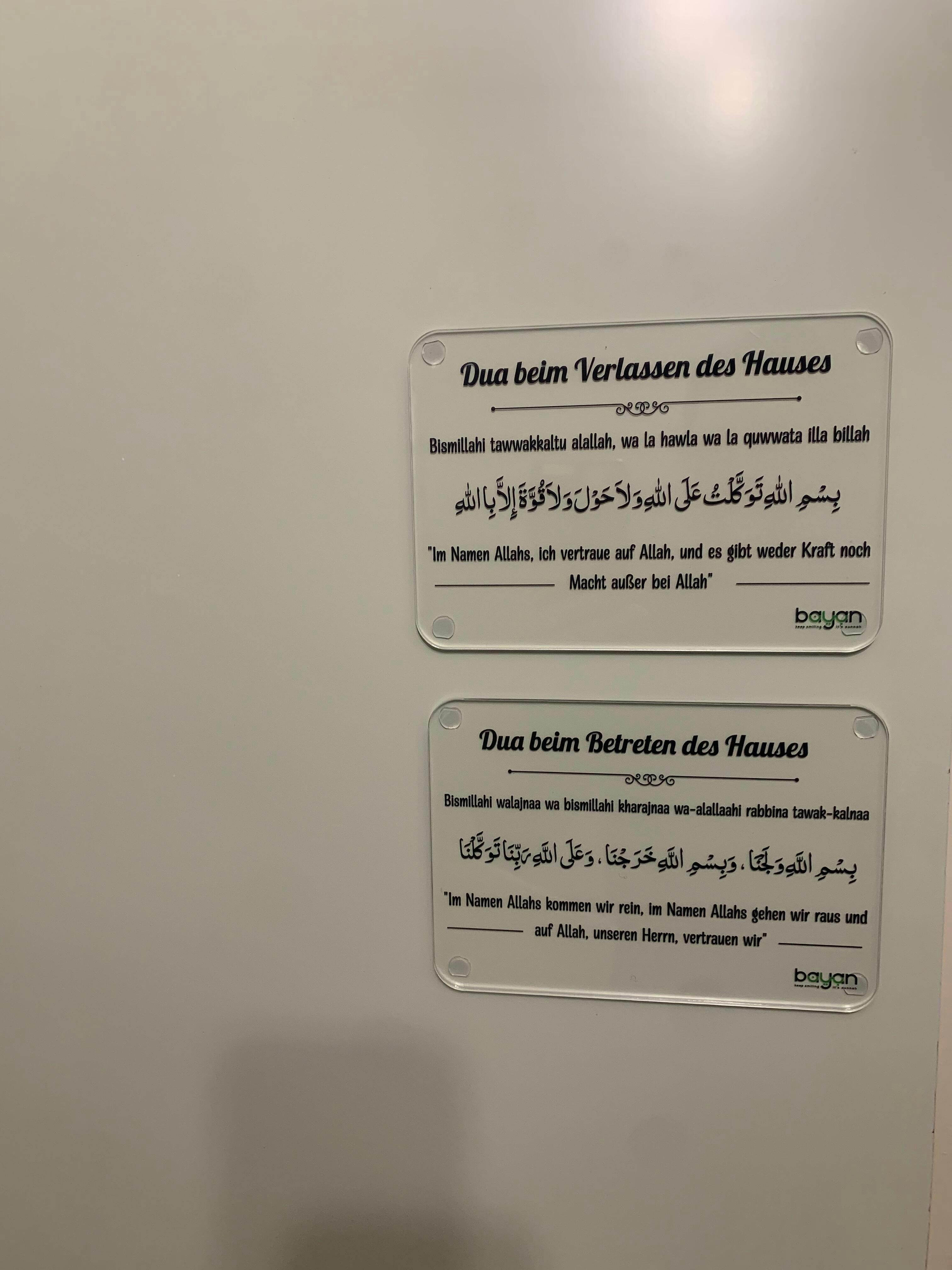 Unsere Dua-Tafeln aus 3 mm Acrylglas sind nicht nur stilvolle Dekorationen, sondern auch eine tägliche Erinnerung an wichtige Gebete im Alltag. Jedes Design wurde vollständig von Bayan entworfen und mit viel Liebe zum Detail gestaltet. Jede Tafel enthält eine bedeutungsvolle Dua, die dich bei deinen täglichen Routinen begleitet und spirituelle Inspiration schenkt.