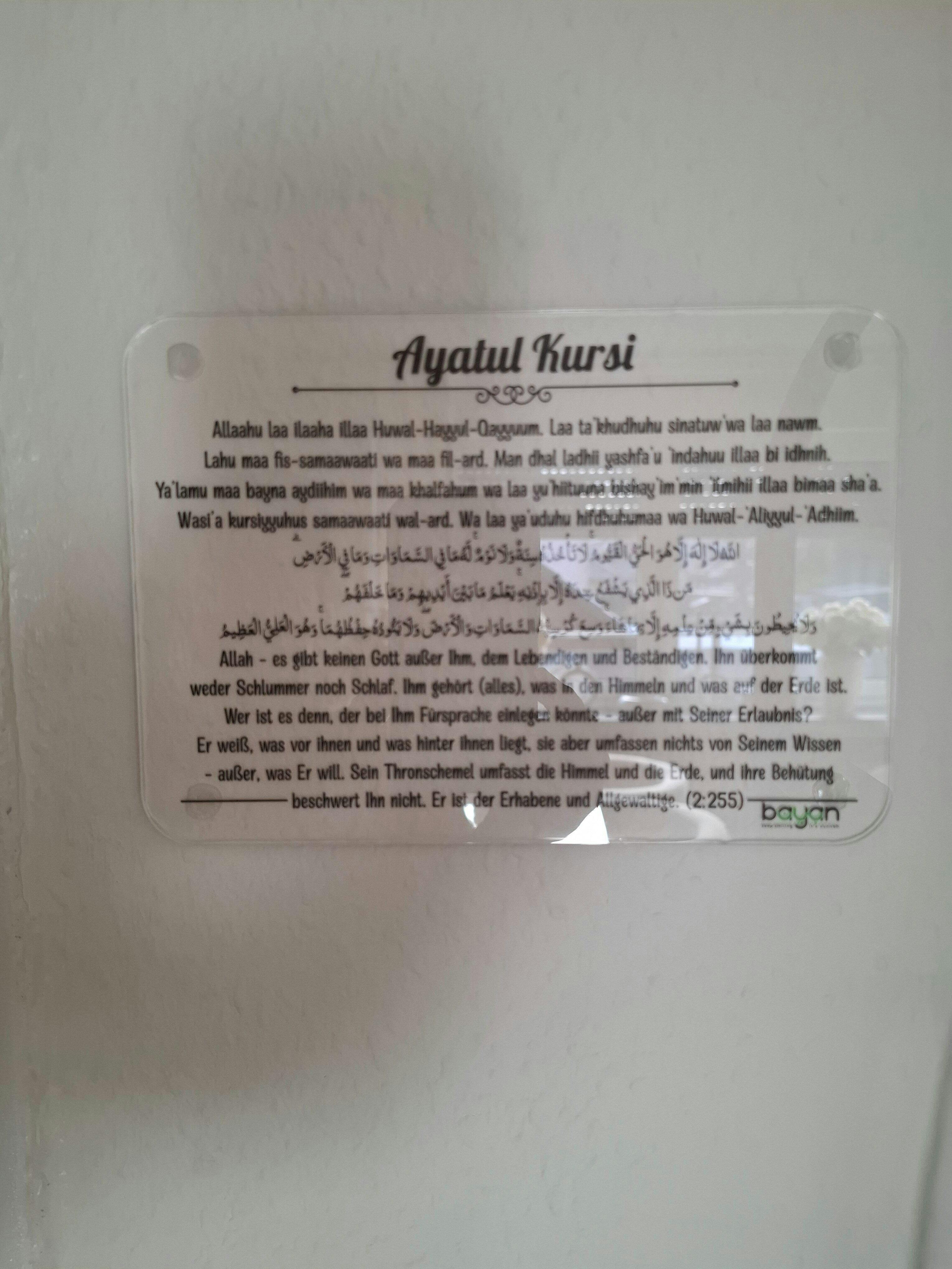 Diese hochwertige Acrylplatte mit dem Ayatul Kursi Vers ist eine edle und bedeutungsvolle Ergänzung für dein Zuhause. Das Design wurde vollständig von Bayan entworfen und besticht durch seine moderne & stilvolle Optik. Der transparente, glänzende 3 mm starke Acryl-Druck verleiht dem Design einen eleganten Look, während die Worte des mächtigen Schutzverses aus dem Qur’an (Sura Al-Baqara, 2:255) im Mittelpunkt stehen.